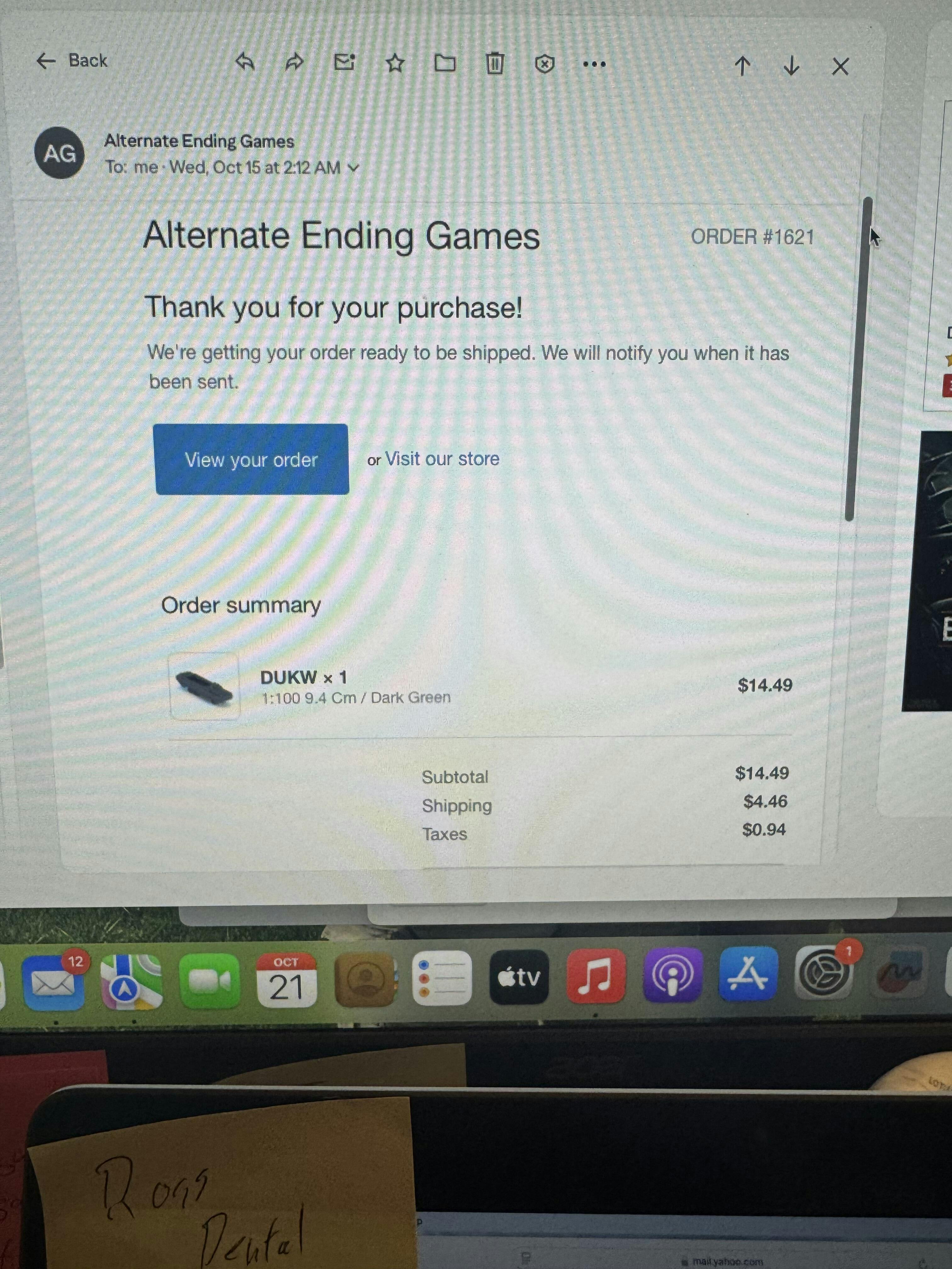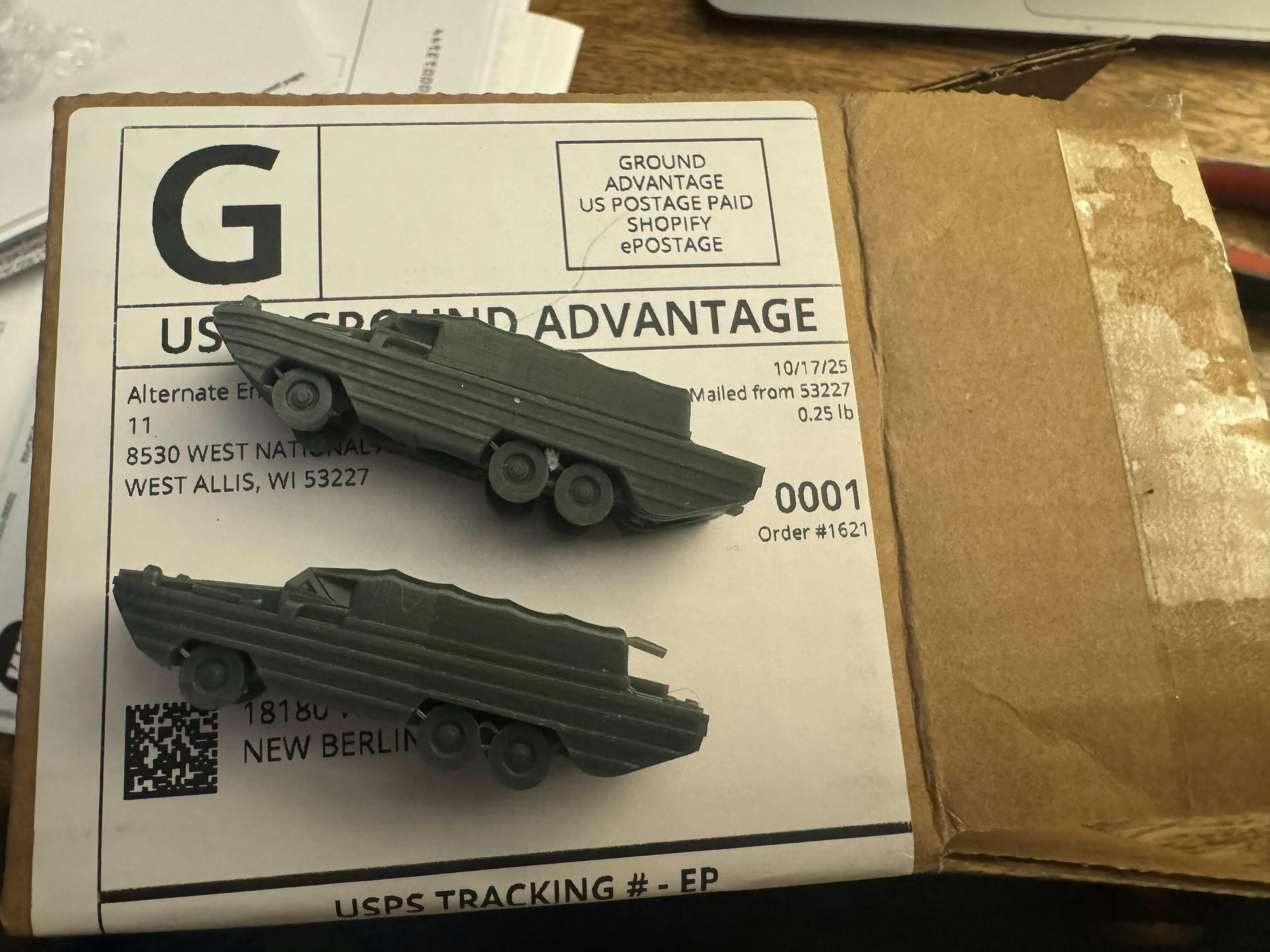 I have tried to contact someone to say order 1621 was all wrong and I want you to make it right. My order 1621 was for 1 open cab ( without canvas top on) dukw 1/100 scale 9.4 cm long in dark green. What I received was 2 dukw with canvas top up in dark green and 1:144 scale 6.5cm long. I want u to correct this mistake and send me what I ordered. I am willing to send back the wrong 2 dukws but no one has contacted me. I have sent an email to alternateendinggames.com days ago and not heard back. I am willing to send more business to you but so far your response has been disheartening. Please contact me to make this right. Leo Jankowski [****]