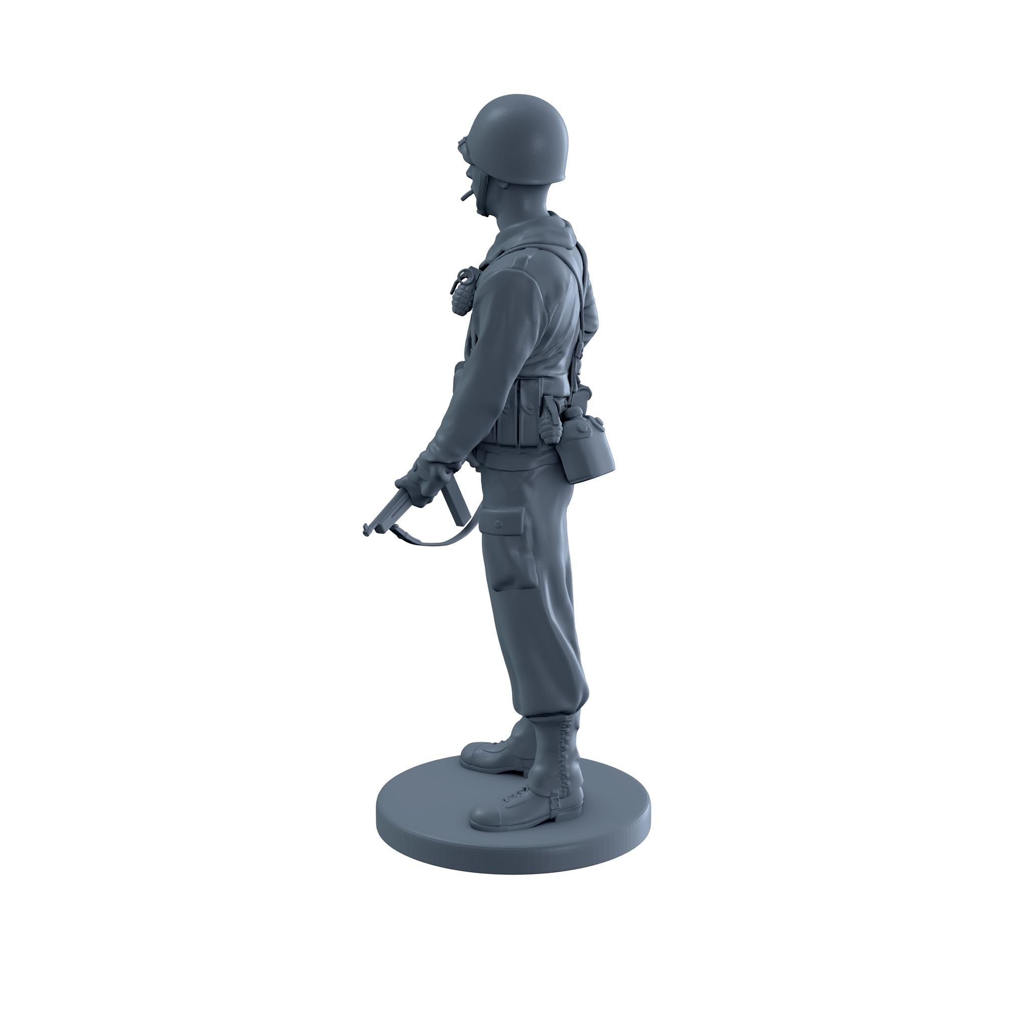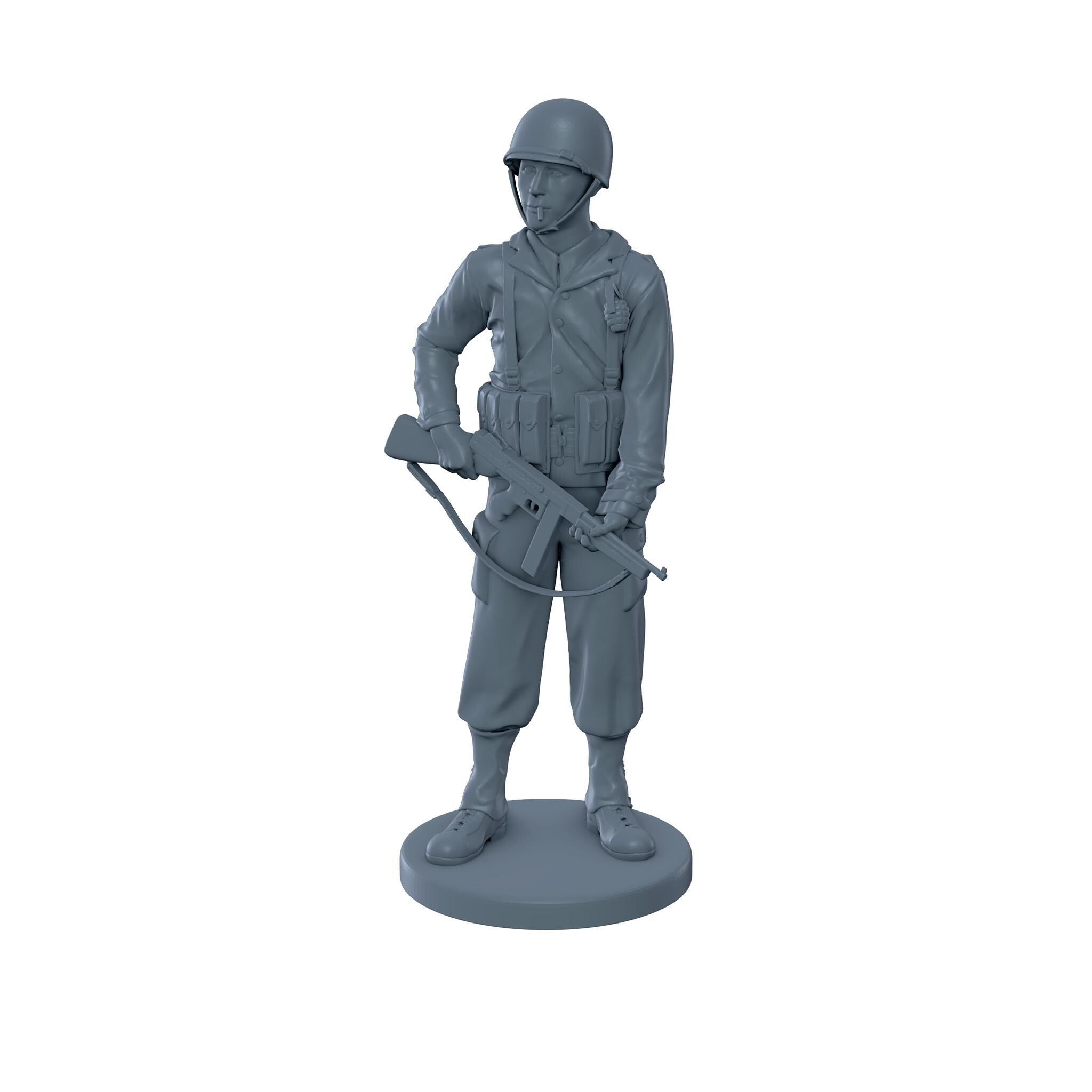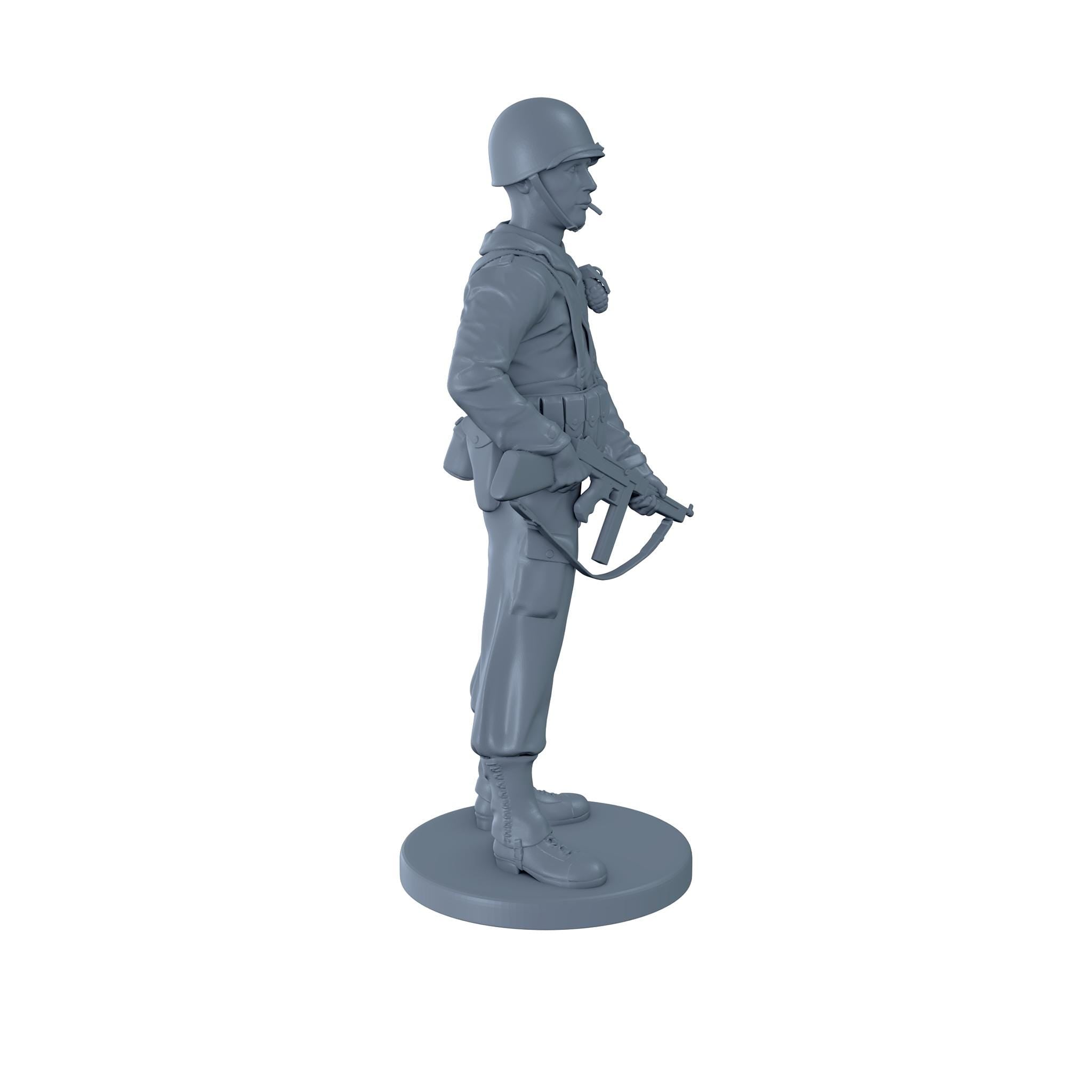 An American soldier holding a thompson sub machine gun at his waist while smoking a cigarette