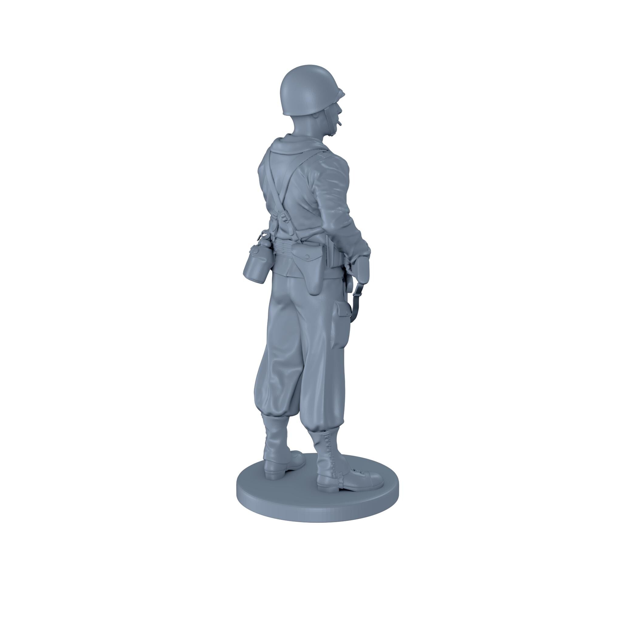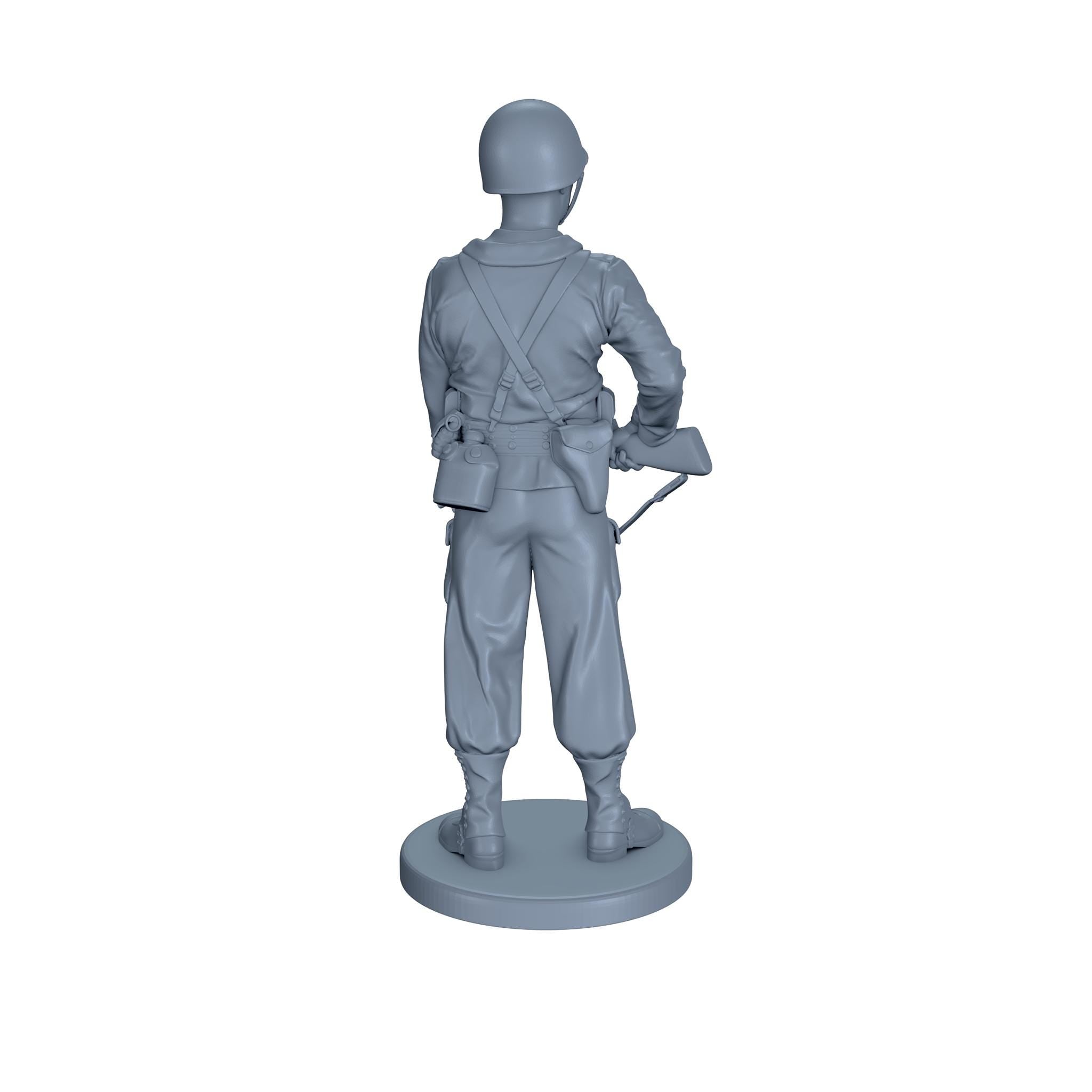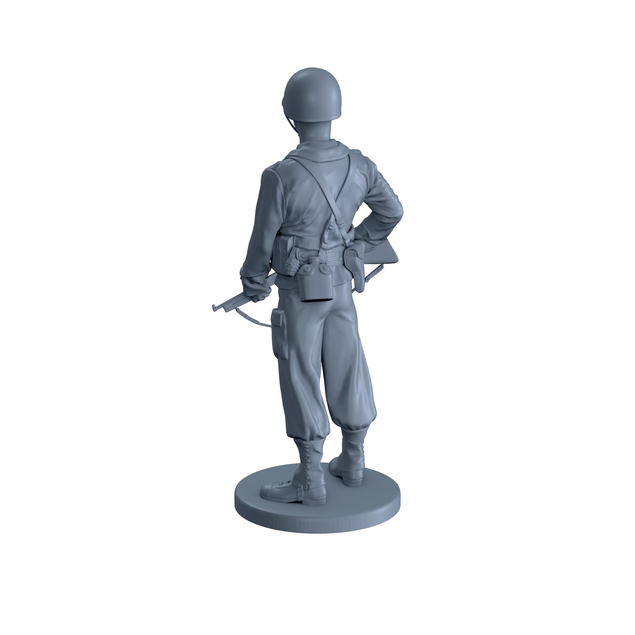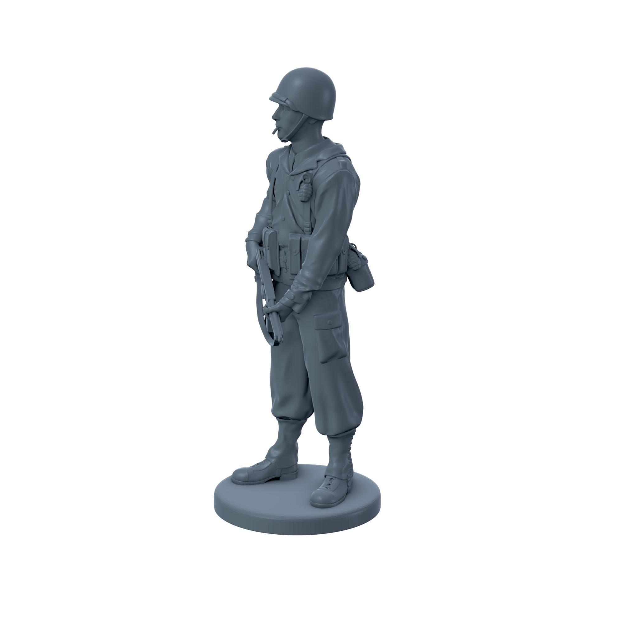 An American soldier holding a thompson sub machine gun at his waist while smoking a cigarette