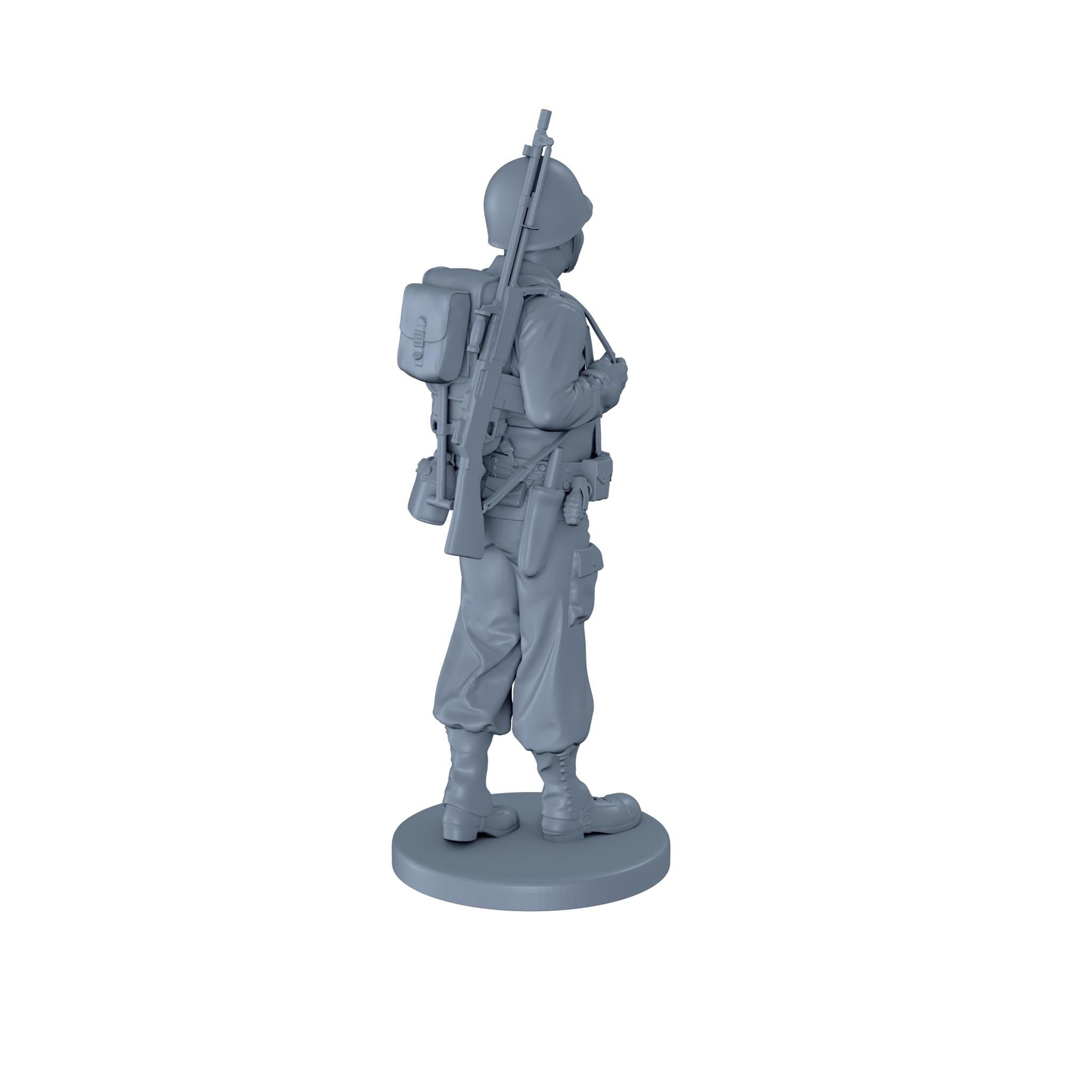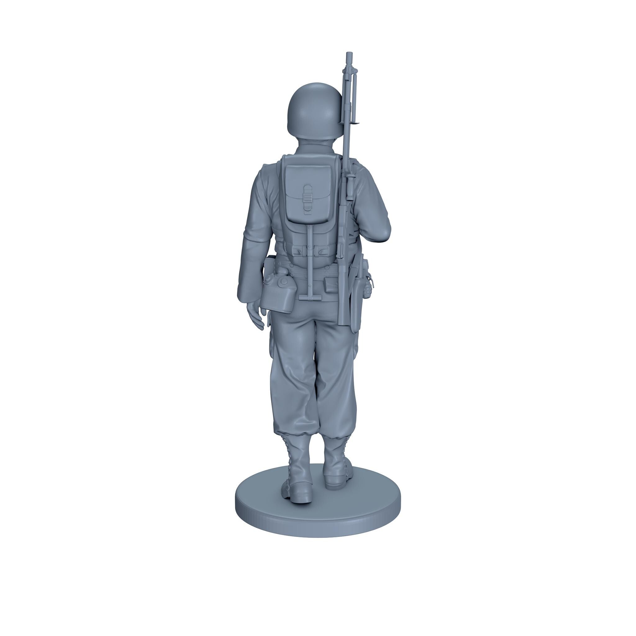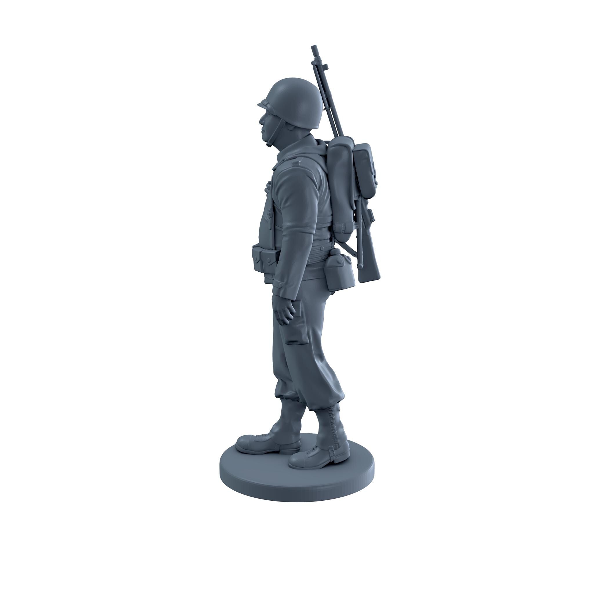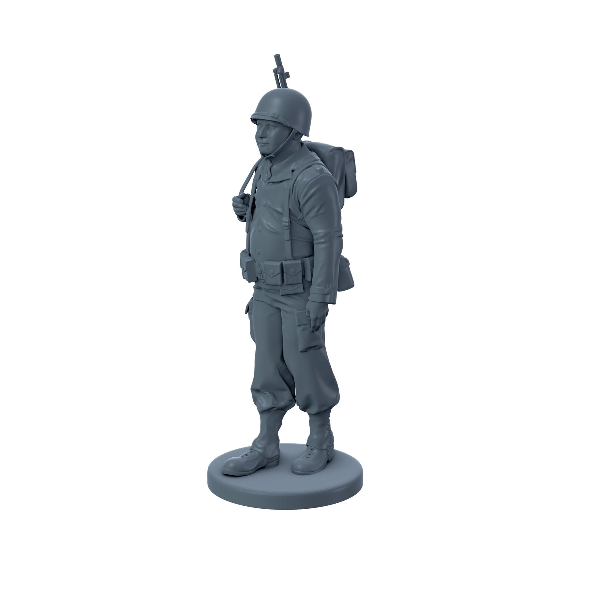 An American soldier from the Second World War with a flawthrower over his shoulder.