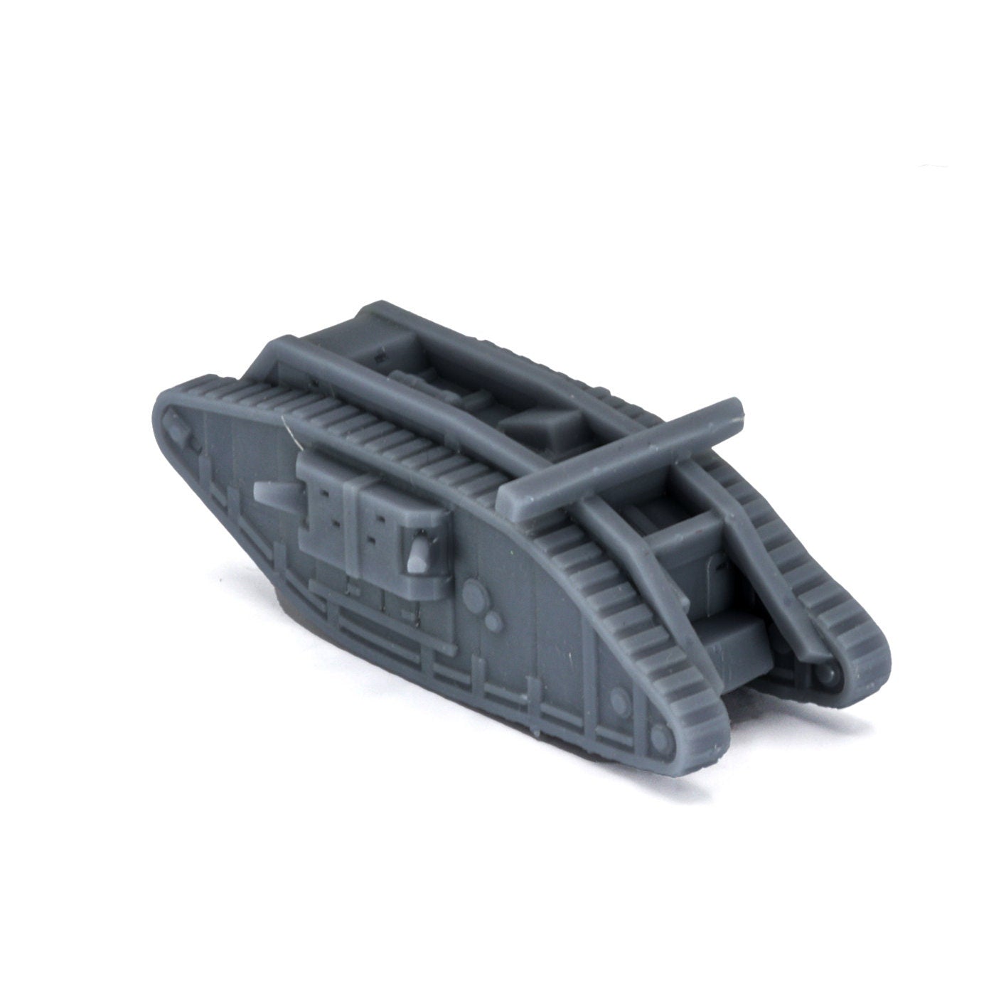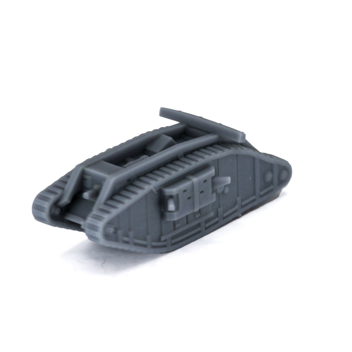 The Mark IV was a more heavily armoured version of the Mark I, and went into production in May 1917. Fundamental mechanical improvements had originally been intended, but had to be postponed. The main change was the introduction of shorter-barrelled 6-pounder guns. It had all its fuel stored in a single external tank (located between the rear track horns) in an attempt to improve crew safety. The sponsons could be swung in on hinges to reduce the width of the tank for rail transportation (previous models required partial disassembly to fit within the loading gauge). Rails on the roof carried an unditching beam. A total of 1,220 were built: 420 males, 595 females and 205 tank tenders, which were supply tanks.